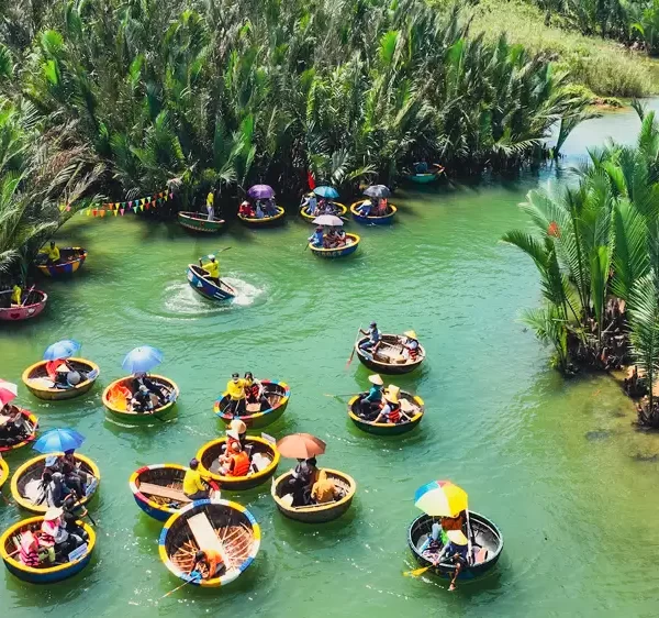 Climb into a round bamboo basket boat — the “thuyền thúng”, beloved icon of these waterways — and surrender yourself to the skill of a local oarsman who has known these channels since childhood. When traveling between Hoi An and Ba Na Hills, this stop provides the perfect cultural balance to the high-altitude wonders of the mountains. With a few flicks of the paddle, the boat spins and glides as if the water itself is dancing beneath you. Further in, the forest deepens and the sky narrows to a single sliver of blue between the palms. Here, you may cast a net alongside weathered fishermen, pull crab traps from the muddy riverbed, or take a cooking class where bánh xèo sizzles on a clay stove beside an open flame. Cam Thanh does not need to perform authenticity — it simply lives it, wholeheartedly, every single day.
